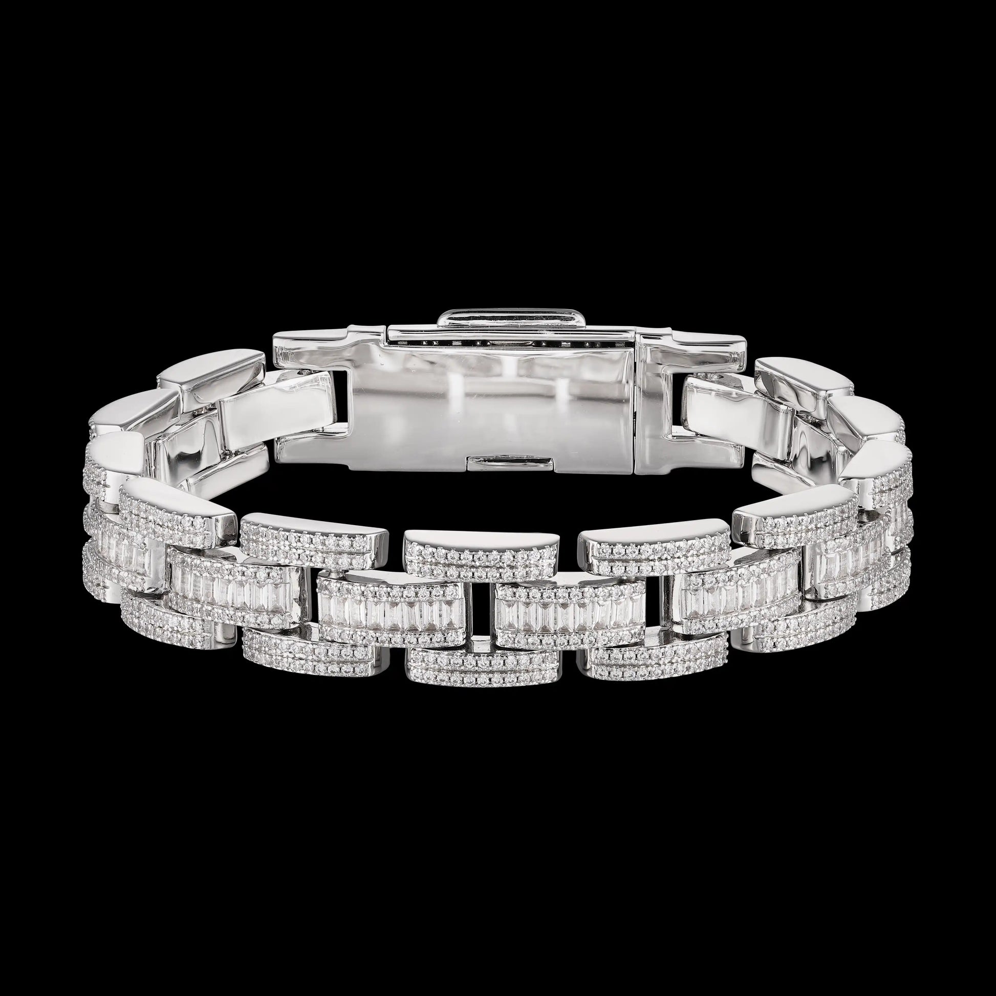 The 3 Row Baguette & Round Iced Bracelet features a luxurious blend of baguette and round 5A CZ stones set in brass, designed in a luxury watch link style. With its bold, iced-out design, this bracelet delivers maximum shine and elegance, perfect for adding flair to any outfit.
