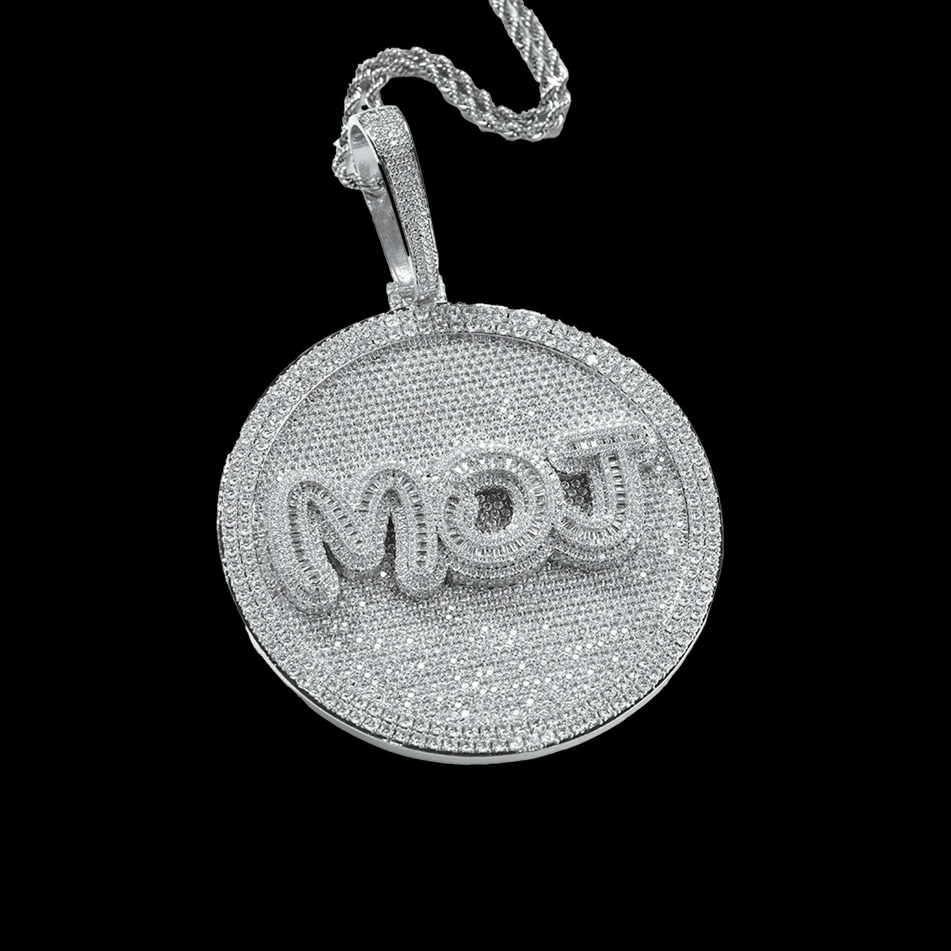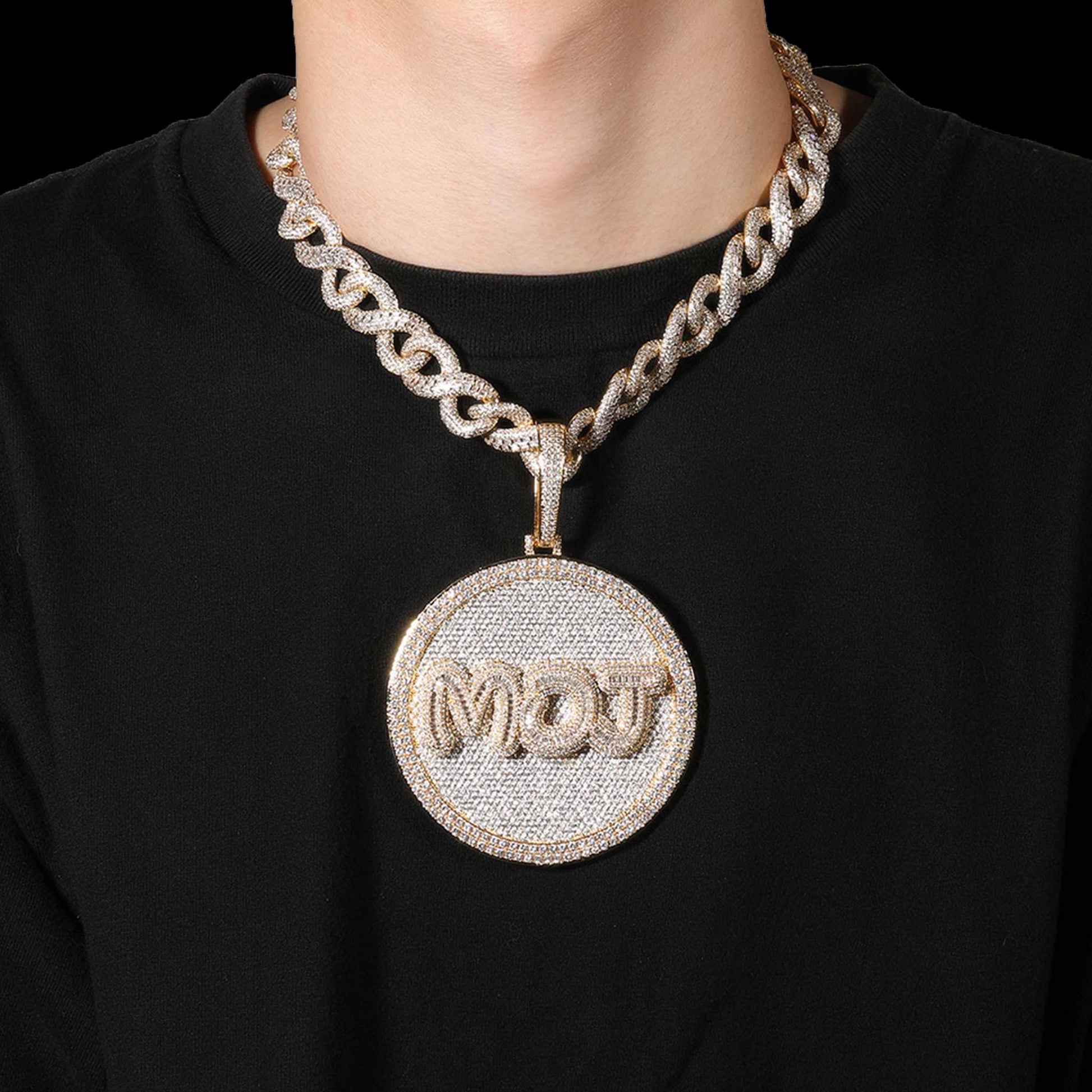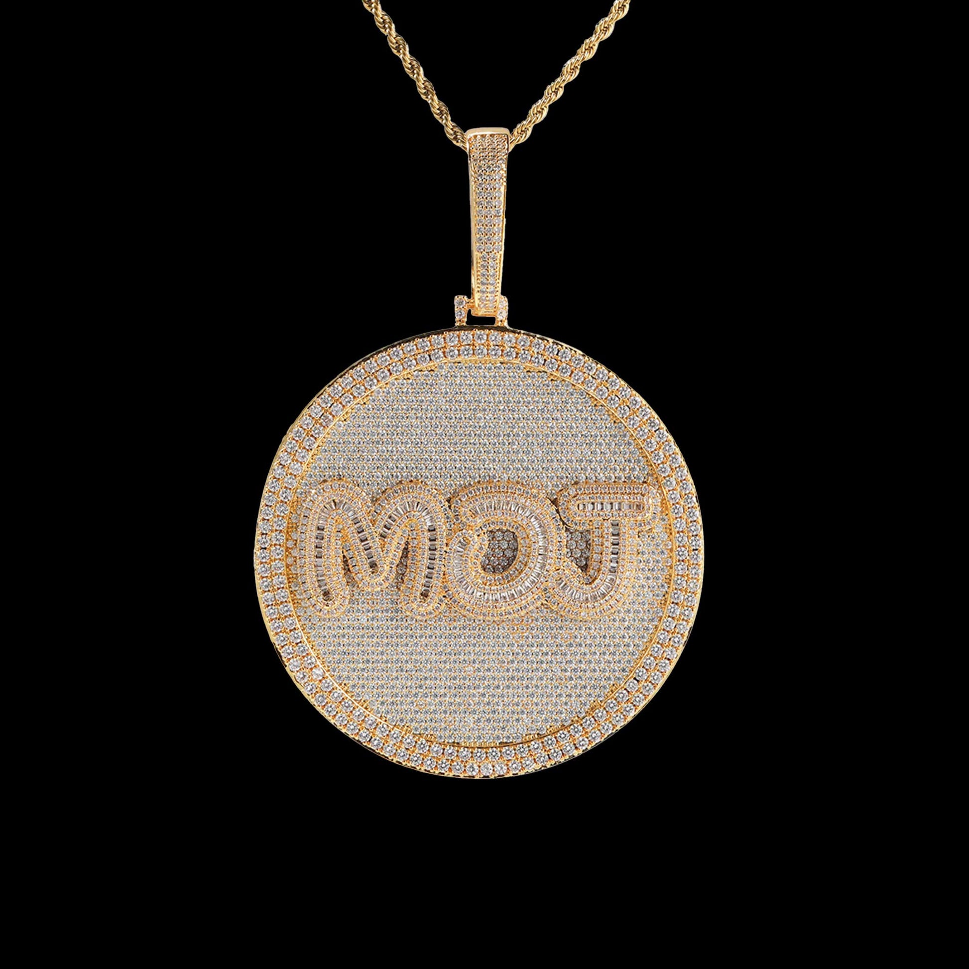 This Custom Baguette Cut Letter 3D Circle Custom Pendant is perfect for personalization. Crafted of a baguette cut surrounded by round cut CZ stones. you can customize up to 3 letters. Showcase your initials in a timeless and chic way with this beautiful pendant.