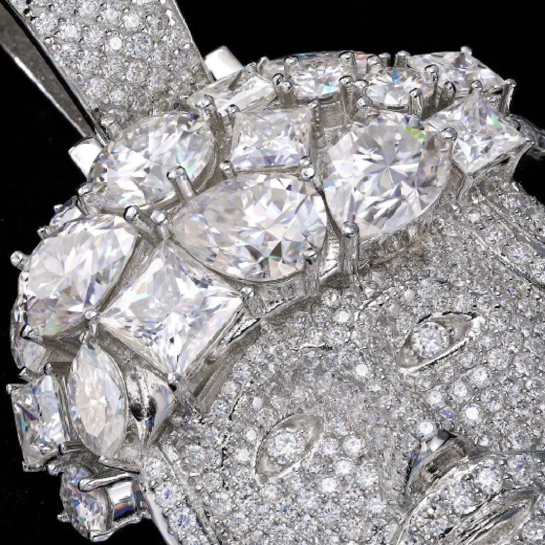 Make a powerful statement of style and spirit with our Multi-Cut Gem Crown Jesus Moissanite Pendant. This piece features a bold Jesus face design adorned with a regal crown, set with brilliant moissanite stones in multiple cuts—round, baguette, and princess—for maximum shine from every angle.